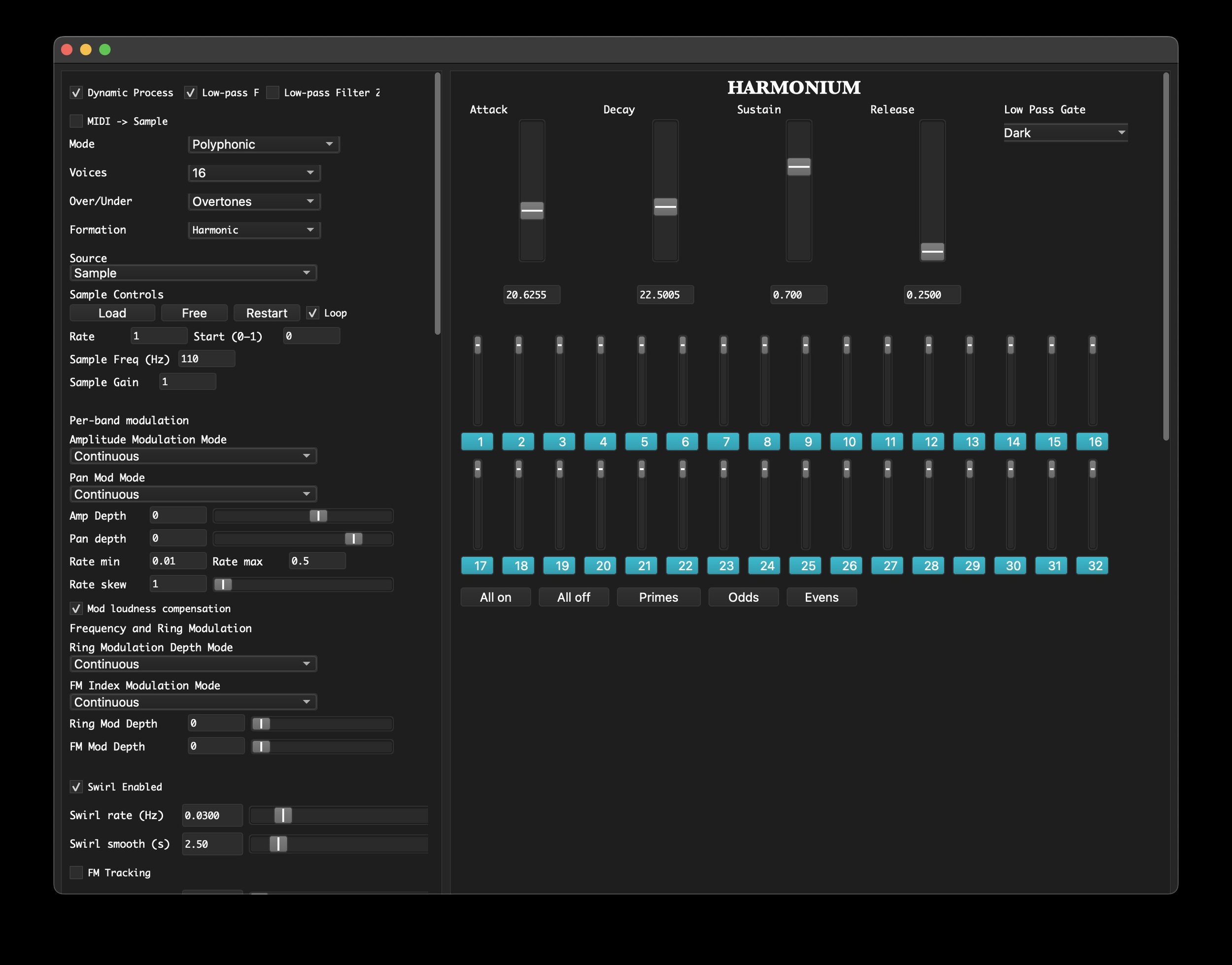 Harmonium also includes several custom processes for working with this spectrum, including per-partial amplitude and panning control, LFO patterns, spectral displacement, FM and ring modulation options, pulsing or swirling harmonic motion, and multiple feedback configurations.